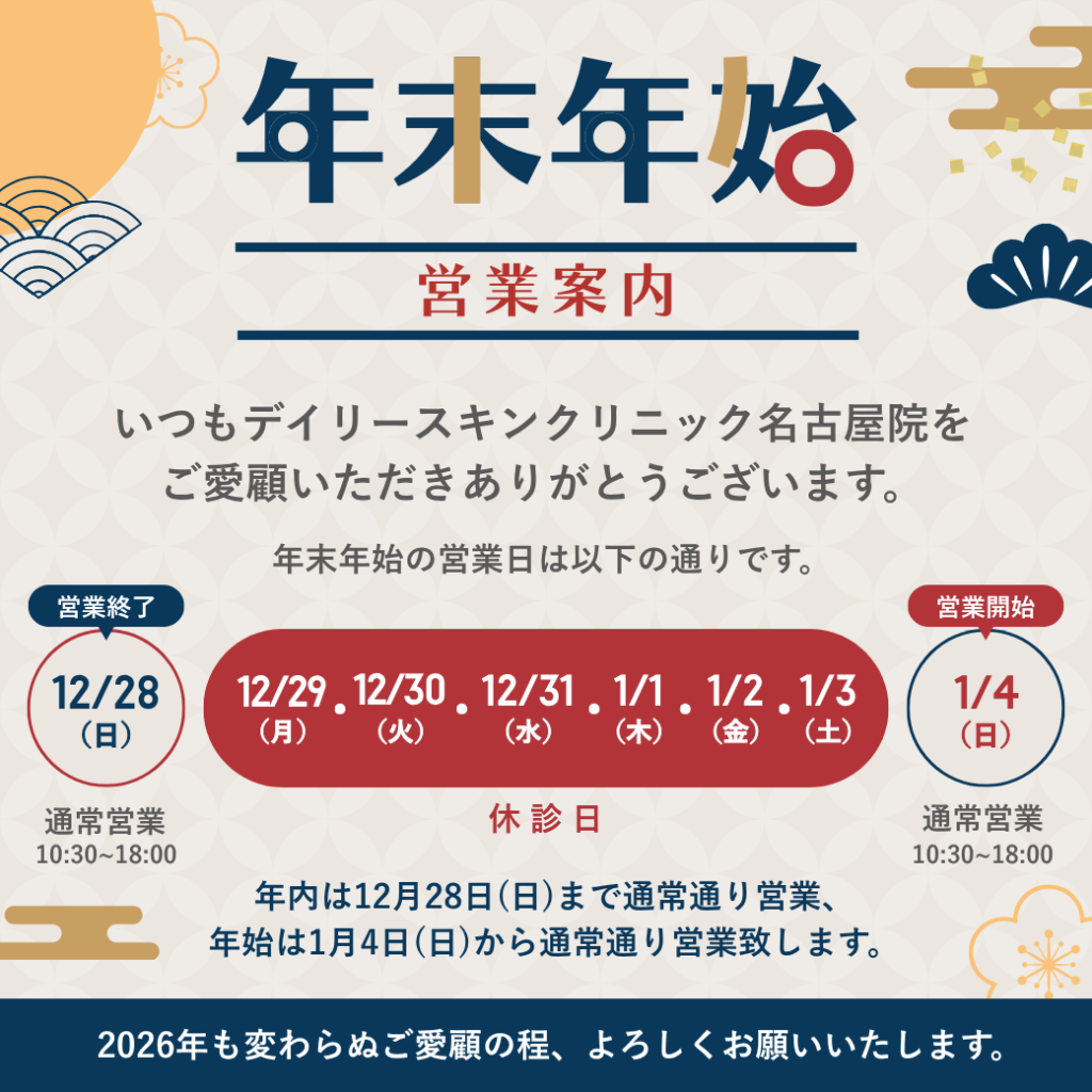 いつもデイリースキンクリニック名古屋院をご利用いただき、誠にありがとうございます。年末年始の営業は以下の通りです。