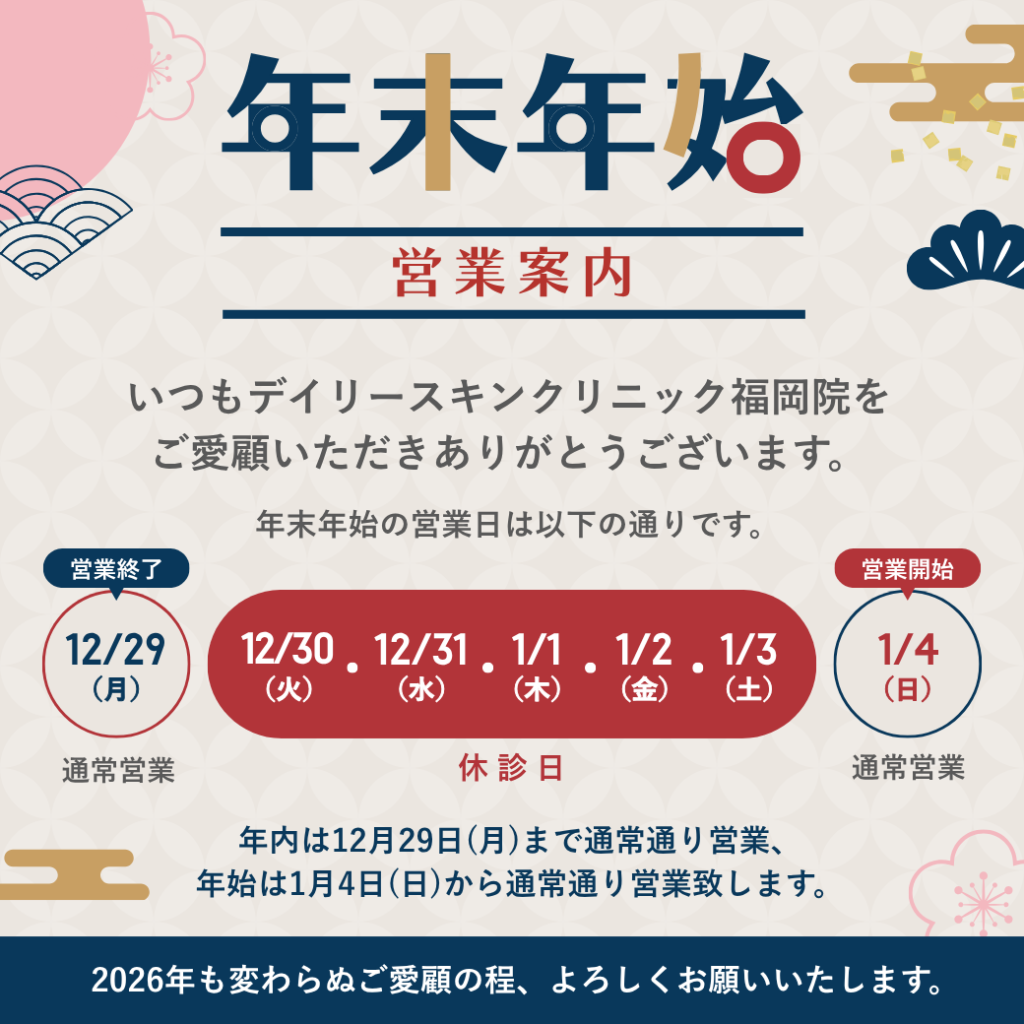 いつもデイリースキンクリニック福岡院をご利用いただき、誠にありがとうございます。年末年始の営業は以下の通りです。