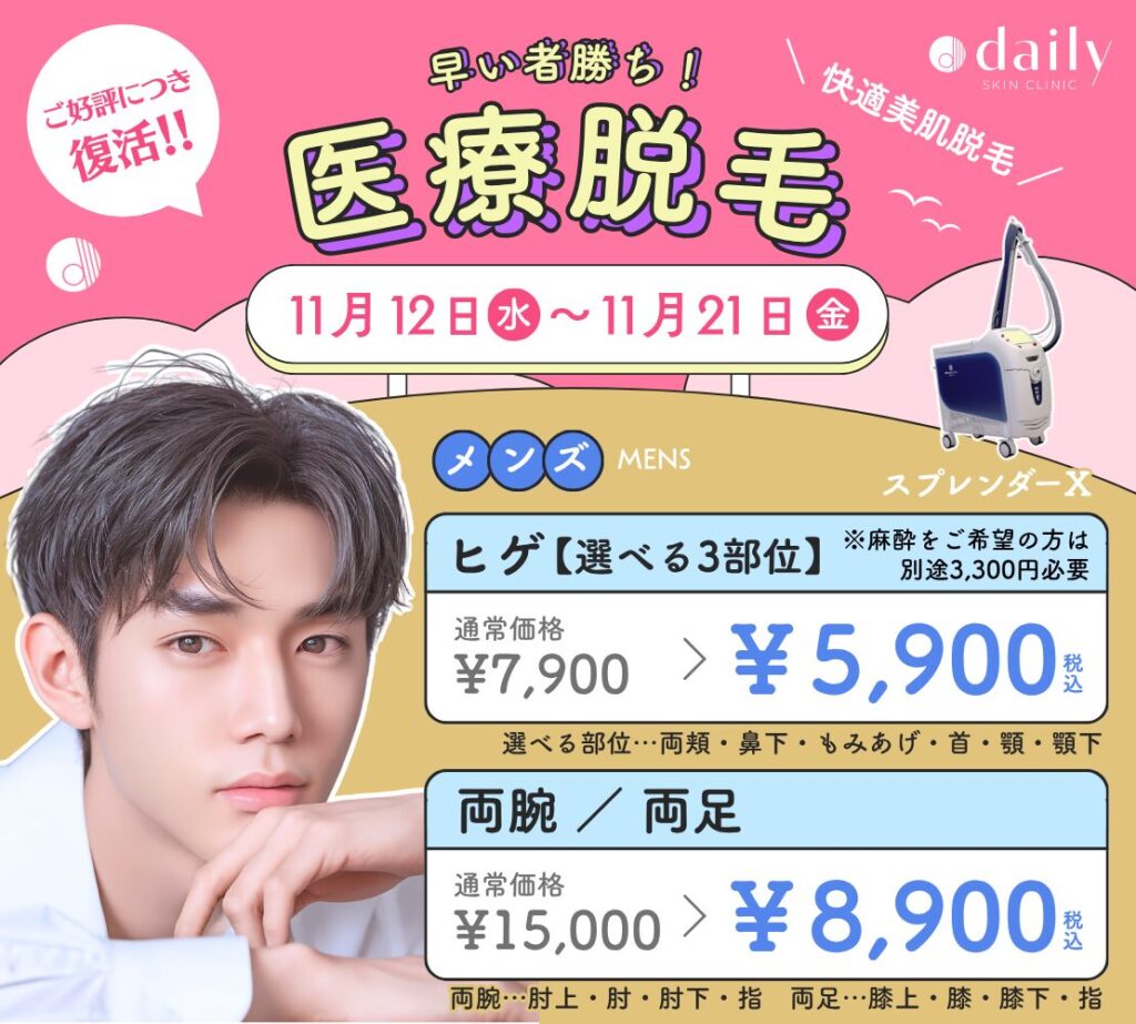 👨男性:ヒゲ3部位¥𝟓,𝟗𝟎𝟎/両腕or両足¥𝟖,𝟗𝟎𝟎